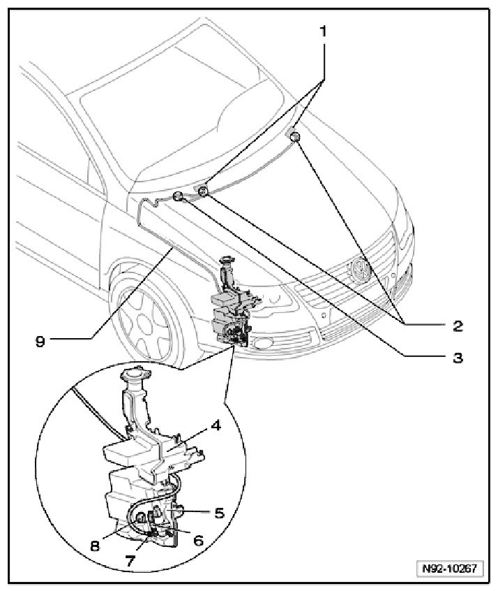 NOTE: The washer fluid tank is installed as a one- or two-part version, depending on equipment. The following illustration depicts the two-part sedan version of the windshield washer/headlamp cleaning system.