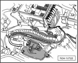 - Lower Engine/Transmission Jack VAG 1383 A and guide steering gear wiring harness back.