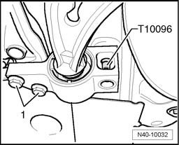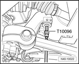 - Replace attachment bolts at mounting bracket, one after the other, on both sides by locating pins T10096 and tighten to 20 Nm.