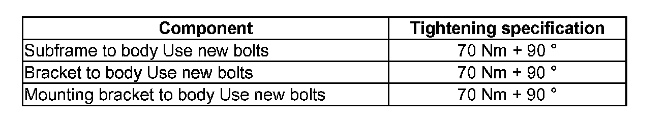 - Replace bracket bolts one after the other with locating fixtures T10096 and tighten to 20 Nm.