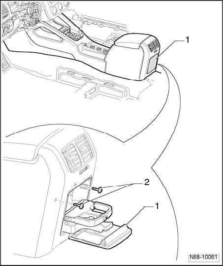 - Open beverage holder - 1 - and remove two bolts - 2 - (1.5 Nm).