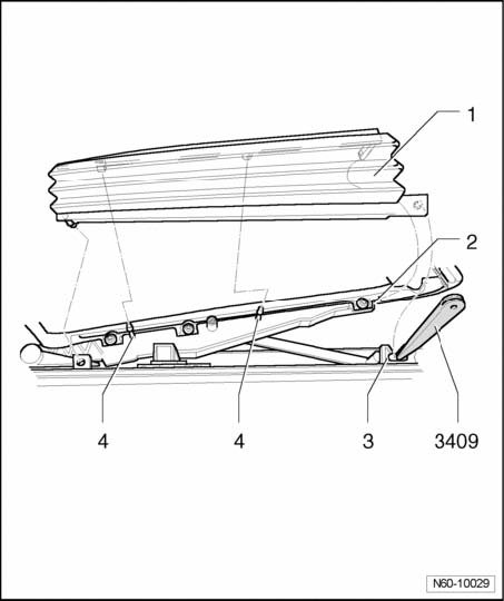 - Carefully unclip bellows - 1 - from lower section of slotted guide rail - 3 - using a trim removal wedge 3409 .