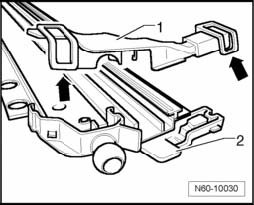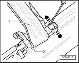 - Using a screwdriver, carefully disengage rain channel - 1 - in - direction of arrow - on both sides at bearing on guide retaining tabs - 2 - and remove rain channel.