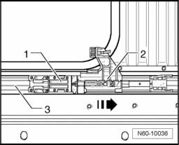 - Pull lower part of rear guide - 1 - and guide catch - 2 - together in - direction of arrow - out of guide rail - 3 -.