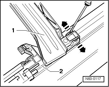 - Using a screwdriver, carefully disengage rain channel - 1 - in - direction of arrow - on both sides at bearing on guide retaining tabs - 2 - and remove rain channel.
