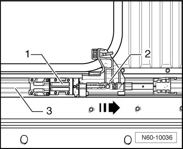 - Pull lower part of rear guide - 1 - and guide catch - 2 - together in - direction of arrow - out of guide rail - 3 -.