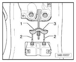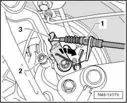 - Loosen adjustment nut - 1 - far enough until respective parking brake cable - 2 - can be disengaged from compensator bracket - 3 -.