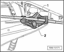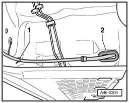 - Disengage parking brake cable from bracket - 1 - and pull hand brake cable out of guide tube - 2 -.