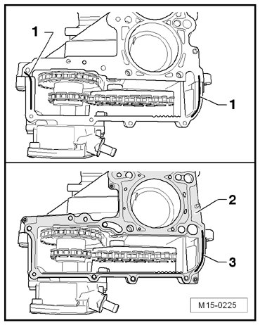 - Apply a bead of sealant - 1 - (front and rear) onto the clean sealing surfaces as illustrated.