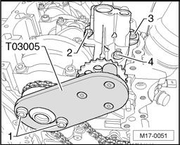 - Tension chain tensioner - 1 -, secure it using Locking Pin T10115 and remove it.