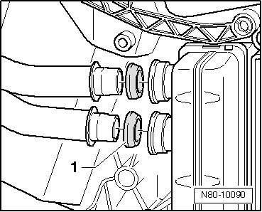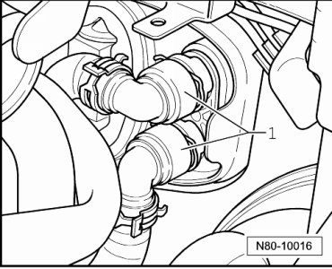 - Clamp off coolant hoses - 1 - using hose clamps up to dia. 40 mm (VAS 3093) and disconnect coolant hoses to heater core.