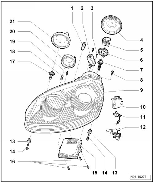 • Removing and installing, refer to=> [ Headlamps, without Headlamp Washer System, GTI ]