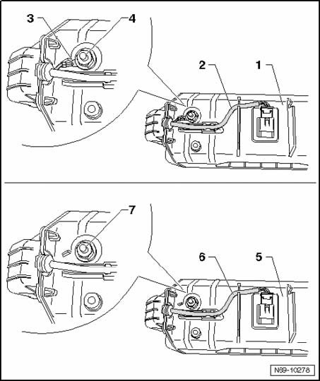- With a passenger airbag without ground line - 5 - , the wiring harness - 6 - is a two connector harness and no additional cable is secured on the threaded pins - 7 -.