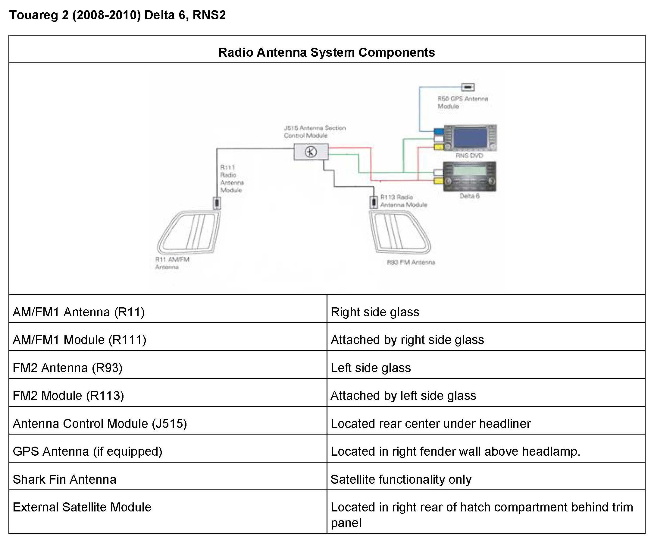 ^ Radios with internal satellite receiver: Is a message displayed on screen stating Satellite radio not available"? This indicates a radio concern. Swapping a known good similar radio is an easy check to confirm the radio is the problem. Applies to RNS-510, RNS-315, RCD-510, RCD-310 (with sat).
