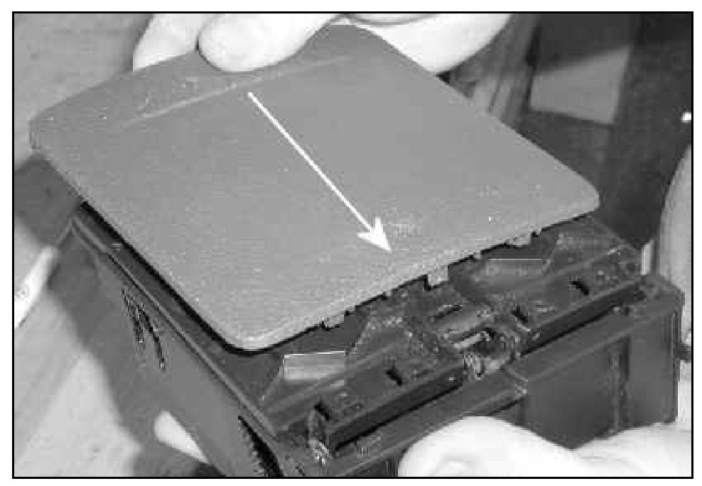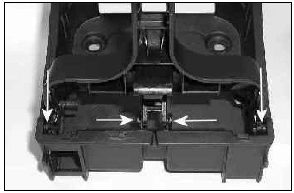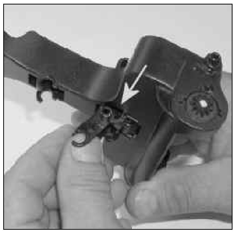 Tip: Upon disassembly the tray gear -arrow- may pop out of place and fall into the tray. If this occurs, snap gear back on to tray support.