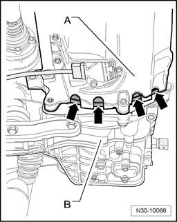 Some recesses -arrows- are located between engine -A- and transmission -B- in lower area of engine oil pan.
