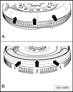 - The outer contour of the flywheel can also be inspected by removing the small cover plate -A-.