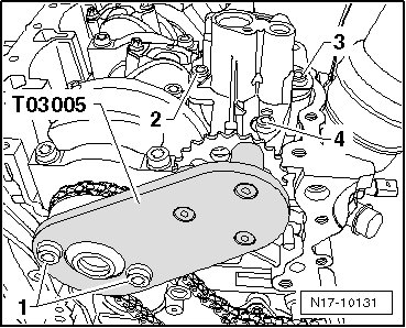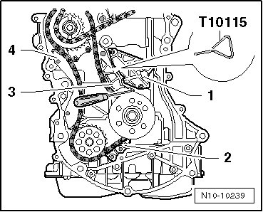 - Tension the oil pump drive chain tensioner - 1 -, secure it using the (T10115) and remove it.