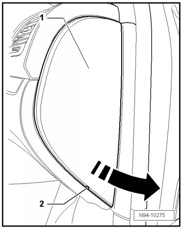 - Remove side cover - 1 - of instrument panel, do this by inserting trim removal wedge (VAS 3409) or a screwdriver into recess - 2 - and pry off cover - 1 - in - direction of arrow -.