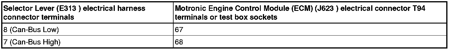 - Using a multimeter, check the Selector Lever ( E313) electrical harness connector to the Motronic Engine Control Module (ECM) (J623) electrical harness connector T94 for resistance.