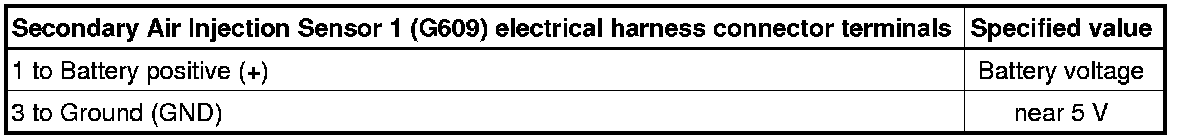 - Using a multimeter, check the Secondary Air Injection Sensor 1 (G609) electrical harness connector for voltage using the chart below.