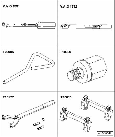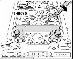 - Install camshaft locator T40070 as depicted on to camshafts and tighten bolts to 20 Nm.