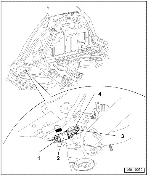 - Press connector lock - 1 - toward rear - arrow - and disconnect connector - 2 - from crash sensor - 4 -.
