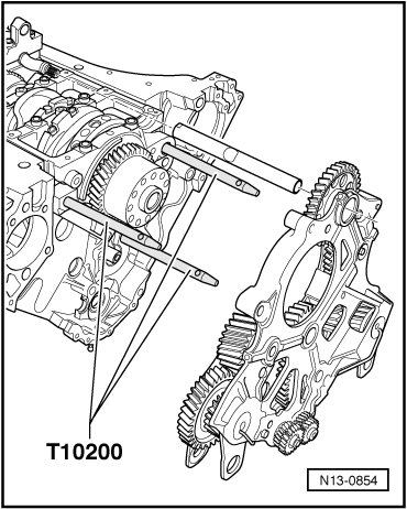 - Replace the guide pins (T10200) s with bolts and tighten the bolts to 60 Nm.
