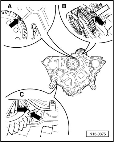 - The holes on the splines of the crankshaft gear and input gear for the oil pump must align as shown.