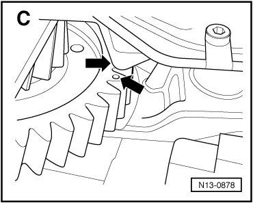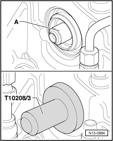 - Center the engine timing module by placing the pressure piece (T10208/3) from the assembly tool (T10208/3) on the generator shaft end - A -. The pressure piece must be able to be set into the countersink without force.