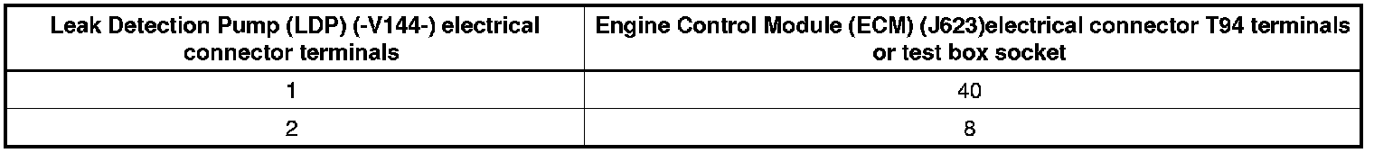 - Using a multimeter, check the Leak Detection Pump (LDP) (-V144-) electrical connector terminals to Engine Control Module (ECM) (J623) electrical connector T94 terminals for an open circuit.