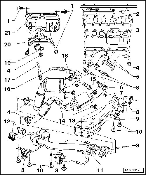 • Must be removed to remove catalytic converters - item 11 -. Refer to => [ Catalytic Converters ] Catalytic Converters.
