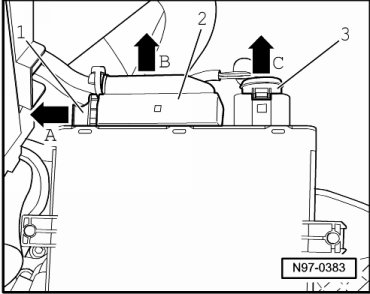 - Push locking hooks of bracket outward - arrows B - and pull Access/Start Authorization Control Module (J518) - 1 - behind bracket forward - arrow A -.