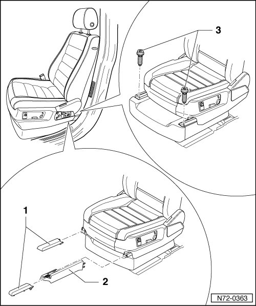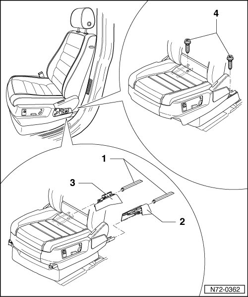 - Remove caps - 2 - and - 3 - from both seat rails. Refer to => [ Seat Rail Covers ] Seat Rail Covers.