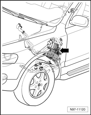 Behind left front wheel housing liner -Arrow-