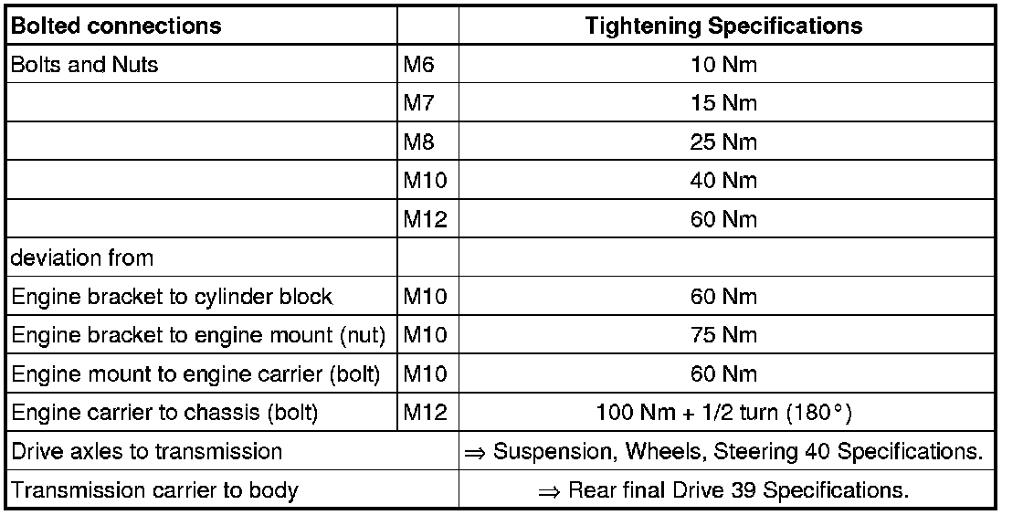 • When installing engine/transmission assembly to the body, it is always necessary to bring the engine carrier into contact on the body using the scissor lift table (VAS 6131). By pulling up the engine carrier via the mounting bolts, the threaded inserts will be damaged!