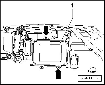 - Remove both mounting bolts - arrows - and remove HID headlamp control module - 1 - straight out of headlamp housing.