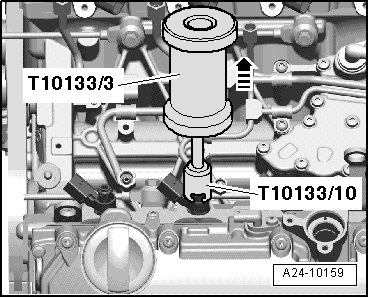 - Guide puller (T10133/10) into groove on fuel injector and carefully drive fuel injector out in - direction of arrow -.
