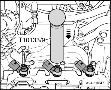 - Slide fuel injector into the bore cylinder head as far as stop using assembly drift (T10133/9).
