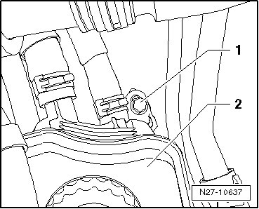 - Remove mounting bolt - 1 - for hydraulic oil reservoir - 2 -, remove reservoir - 2 - from reservoir and external starting point bracket and lay it aside with hoses connected.