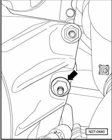 - Remove the upper bolt for the starter - arrow - on the transmission side.