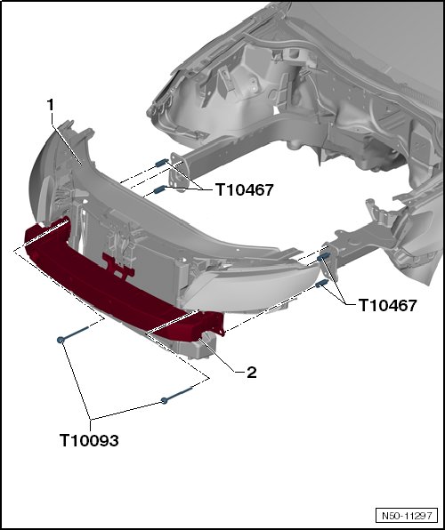 - Attach the lock carrier - 1 - and the front bumper carrier - 2 - to the longitudinal member with the help of a second mechanic.