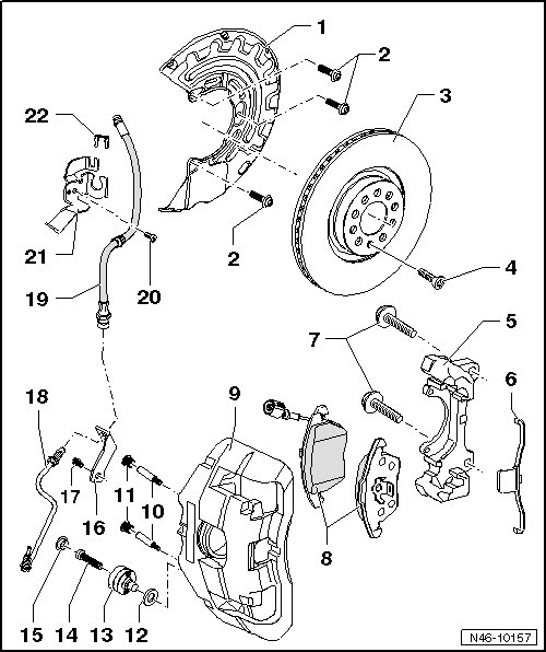 Before removing brake caliper or disconnecting brake hose, brake pedal actuator (V.A.G 1869/2) must be inserted (this dissipates pressure).