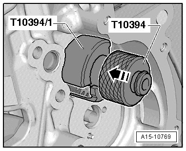 - Install the half shell (T10394/1) from the puller (T10394) and turn it upward in the - direction of the arrow -.