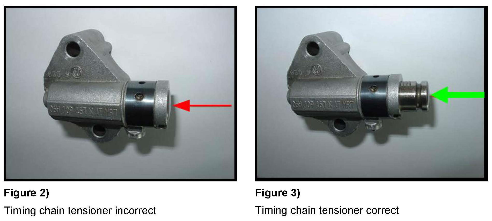 If the piston of the timing chain tensioner can be compressed in by hand (Figure 2, red arrow) the timing chain tensioner has failed, and further engine diagnosis may be required.