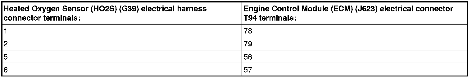 - Using a multimeter, check the Heated Oxygen Sensor (HO2S) (G39) electrical harness connector terminals to the Engine Control Module (ECM) (J623) electrical harness connector T94 terminals for an open circuit.