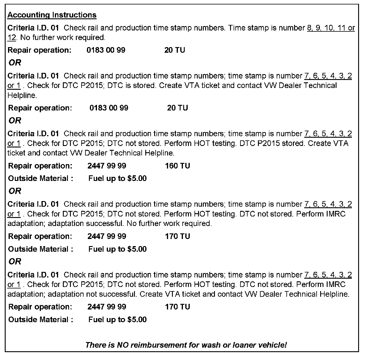 --> If DTC P2015 "Sensor for Intake Manifold Flap Position" is stored, create a VTA ticket and call the Volkswagen Dealer Technical Helpline.