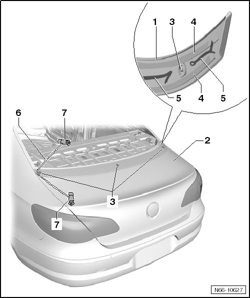 - Thread the cutting cord (357 853 999 A) - 6 - in between the rear lid - 2 - and the trim - 1 -.