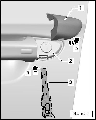 - Remove the lock cylinder cap - 1 - gently from the underside of the door - arrow b - with the emergency key.