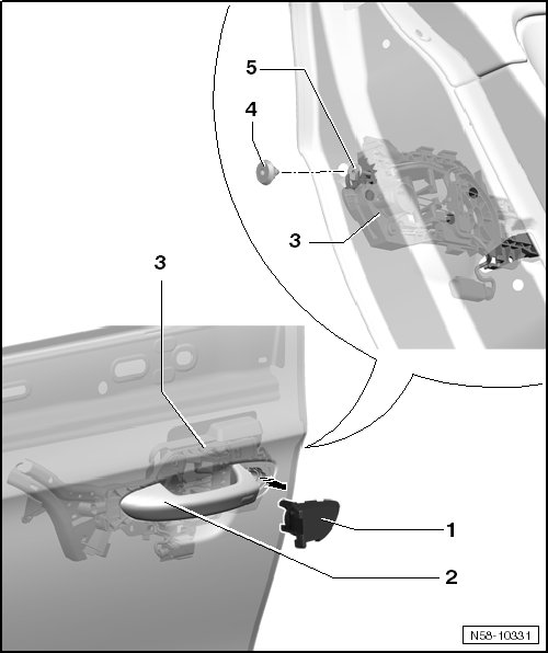 - Pull out the door handle - 2 - until it stops and remove the bolt - 5 - until the lock cylinder housing - 1 - is able to be removed.